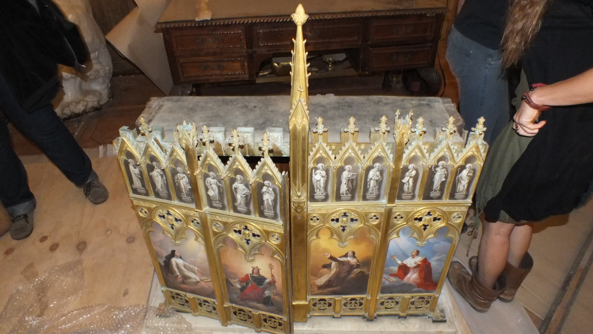 Mueble de 2 metros de alto es de madera tallada con aplicaciones de bronce, mármol y placas de cerámica policromada