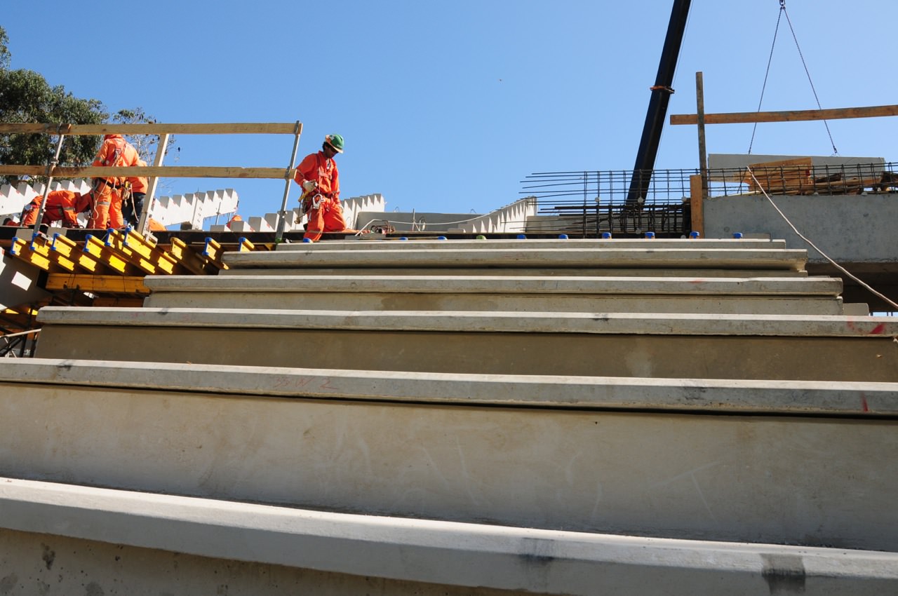 En plena ejecución está proceso de instalación de las estructuras de hormigón pre fabricadas de la galería del codo laguna.